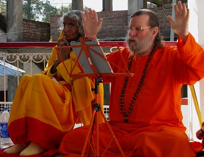 A prayerful moment during Shree Maa and Swamiji’s morning recitation of the Chandi at a small Shiva temple in Palampur.