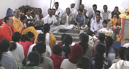 Coming out of meditation, Shree Maa is pleased with the dance performance by a group of children and gives blessings