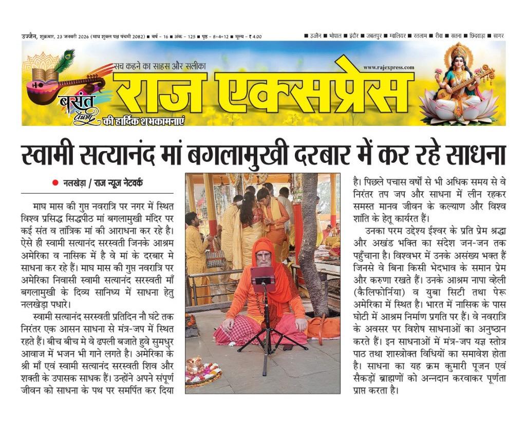 Among the revered spiritual leaders present this year is Swami Satyananda Saraswati, a long-time practitioner of the path of devotion and spiritual discipline. Swami Satyananda Saraswati, whose ashrams are located in the United States, Costa Rica, and currently being established near Nashik in India, arrived at Nalchha Pahadi to perform sacred sadhana in the divine presence of Maa Baglamukhi.
