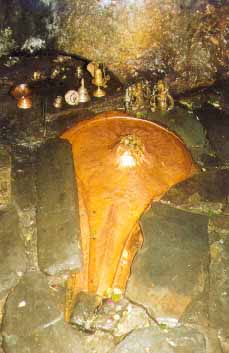 View of the Himalayan Village The cave is such a powerful experience. The first flight of steps descends fifty-five feet vertically upon small steps cut into the solid rock formations. In many instances visitors must lie flat against the rocks to squeeze through the tight formations. Inside the Cave Once inside there is a wonder of amazement. The tunnels and grottos comprise an entire underground community, which obviously dates several millenium before our present era, sort of a Kishkinda for meditating sadhus. The largest of the halls can seat perhaps fifty or more meditators. Where they sat, their backsides rubbed the stones perfectly smooth, so that it is possible to find the perfect indenture to fit any size. They are extremely comfortable to sit in, and the vibrations are extremely conducive for meditation. Chamber of the Main Deity The rock configurations depict perfectly all of the deities of the Hindu Pantheon, and water drips from various sources, making streams and channels throughout. All the Gods and Goddesses are present, and even today visitors can feel the presence of the meditating rishis. Rishi Markandeya wrote the Chandi Path while sitting in this cave, and the main deity of Shiva was established and given life by Shankaracharya. Shiva at Patal Bhuvaneshwar Near the mouth of the cave is a howan kund, where I have performed the Chandi Yagya on several occasions. The view while sitting there looks out over the Himalayas. What a thrill to see the sunrise on the snow-capped mountains, to watch as the mountains glisten in the morning sun, how they change color. Straight ahead is Kailash, a little to the left Nanda Devi, Trishul, Badrinath, Kedarnath, Gangotri and Yamunotri. One peak is more glorious than the next, but all together the vision and ambiance inspires pure devotion. I first visited Patal Bhuvaneshwar in 1971. At that time it was a seven mile walk from the nearest jeepable road. Now it is only a two mile walk. In 1971 I slept on the porch of the Pandit’s house. Now there is a Dharmashalla and other facilities for staying. What a place to do tapasya, where since thousands of years other sadhus have been visiting to add to the spiritual vibration. It is said that the darshan at Patal Bhuvaneshwar yields a thousand times the fruit of tapasya at Kashi, Baidyanath or Kedarnath. In the Skanda Purana, Manas Kanda, Chapter 103, there is a description of the blessings to be attained in visiting Patal Bhuvaneshwar. |