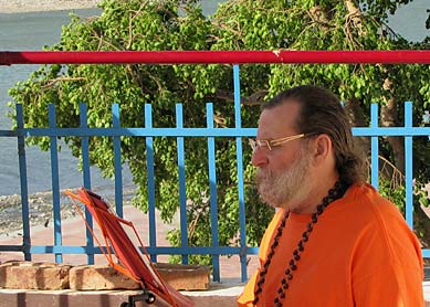 A blessed moment – Swamiji chants the Chandi beside the Ganga in Rishikesh once again.