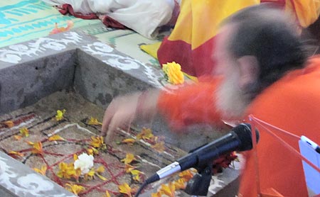 In Ooty, a town located high in the Nilagiri hills of Southern India, Swamiji was asked to perform a Vedic fire ceremony. The preparations including building a structure to hold the fire, called a hawan kunda, and drawing a yantra – a sacred geometrical symbol – onto a layer of sand where the fire would later be lit. After a short introduction, Swamiji began the ceremony around 6:30 p.m., and soon he was reciting a series of mantras while placing flowers at key locations on the yantra before enkindling the fire. Once the fire was established, oblations including clarified butter and grains were then offered to the fire with various mantras.