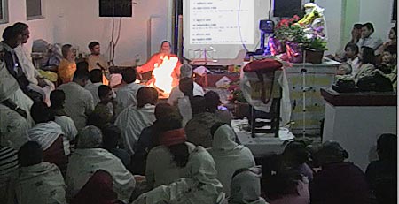 In Ooty, a town located high in the Nilagiri hills of Southern India, Swamiji was asked to perform a Vedic fire ceremony. The preparations including building a structure to hold the fire, called a hawan kunda, and drawing a yantra – a sacred geometrical symbol – onto a layer of sand where the fire would later be lit. After a short introduction, Swamiji began the ceremony around 6:30 p.m., and soon he was reciting a series of mantras while placing flowers at key locations on the yantra before enkindling the fire. Once the fire was established, oblations including clarified butter and grains were then offered to the fire with various mantras.