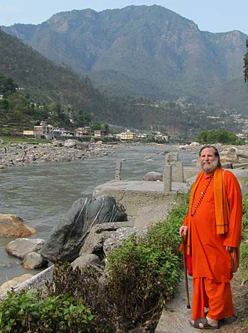 Swamiji walking by the small farms and many ashrams alongside the Ganga in Uttarkashi