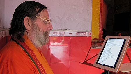 Swami Satyananda Saraswati, a.k.a. the “iPad Swami”, reciting the Shiva Sahasranam in the Vishwanath Temple in Uttarkashi.