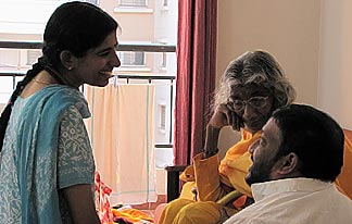 Shree Maa and Swamiji were warmly received in Bangalore where they stopped for a visit and rest along the way. Mantras were ceremoniously recited while their feet were washed and while offerings of flower garlands and light were made.
