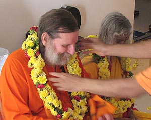 Shree Maa and Swamiji were warmly received in Bangalore where they stopped for a visit and rest along the way. Mantras were ceremoniously recited while their feet were washed and while offerings of flower garlands and light were made.